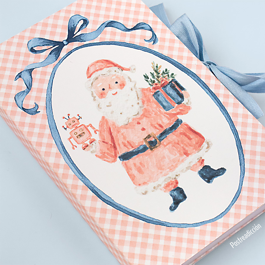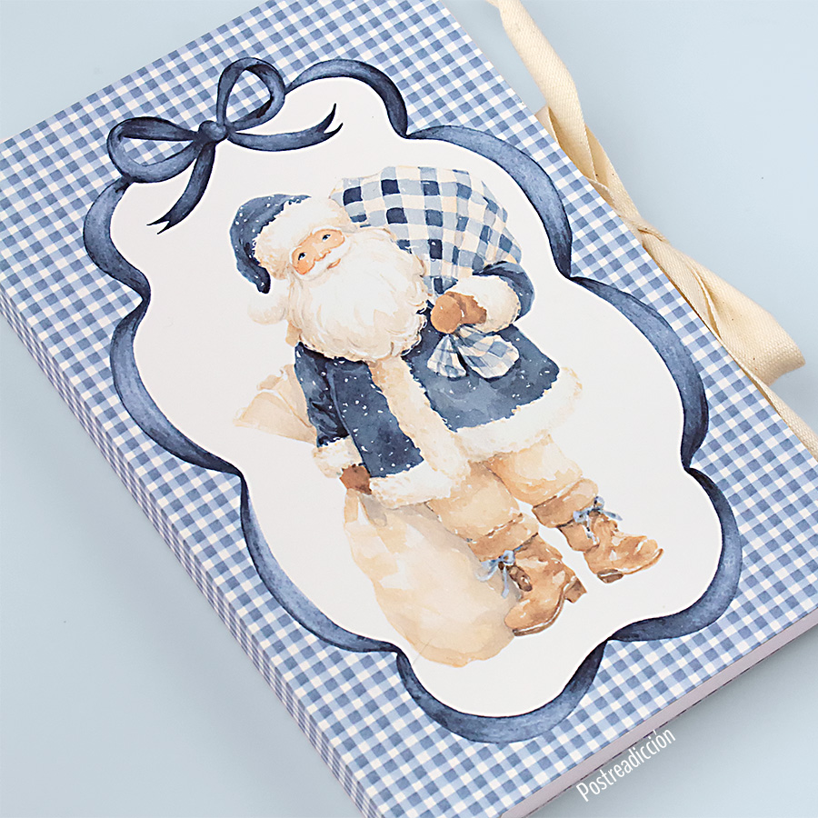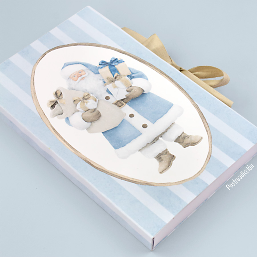 Caja de cartulina con tapa-libro: Papá Noel vichy azul