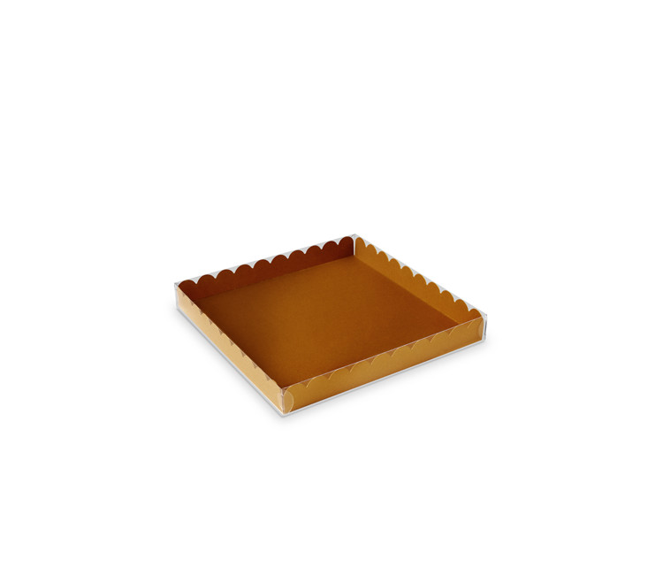 Incluye una caja de cartón dorada metalizada con tapa transparente, sin montar.