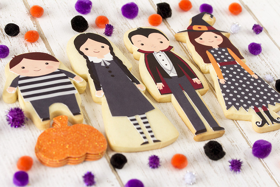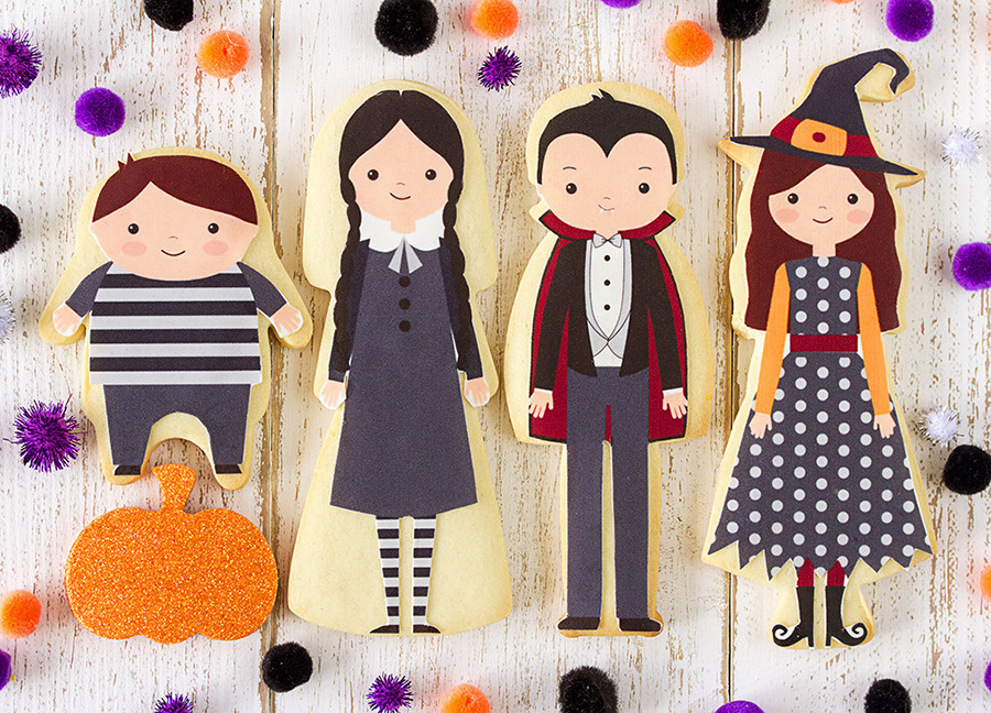 Medidas: las de nuestros cortadores "Niña rosa Celia / Miércoles Addams", "Brujita / niña navideña", "Osito Nicolás / Pericles Addams" y "Vampiro / superhéroe".