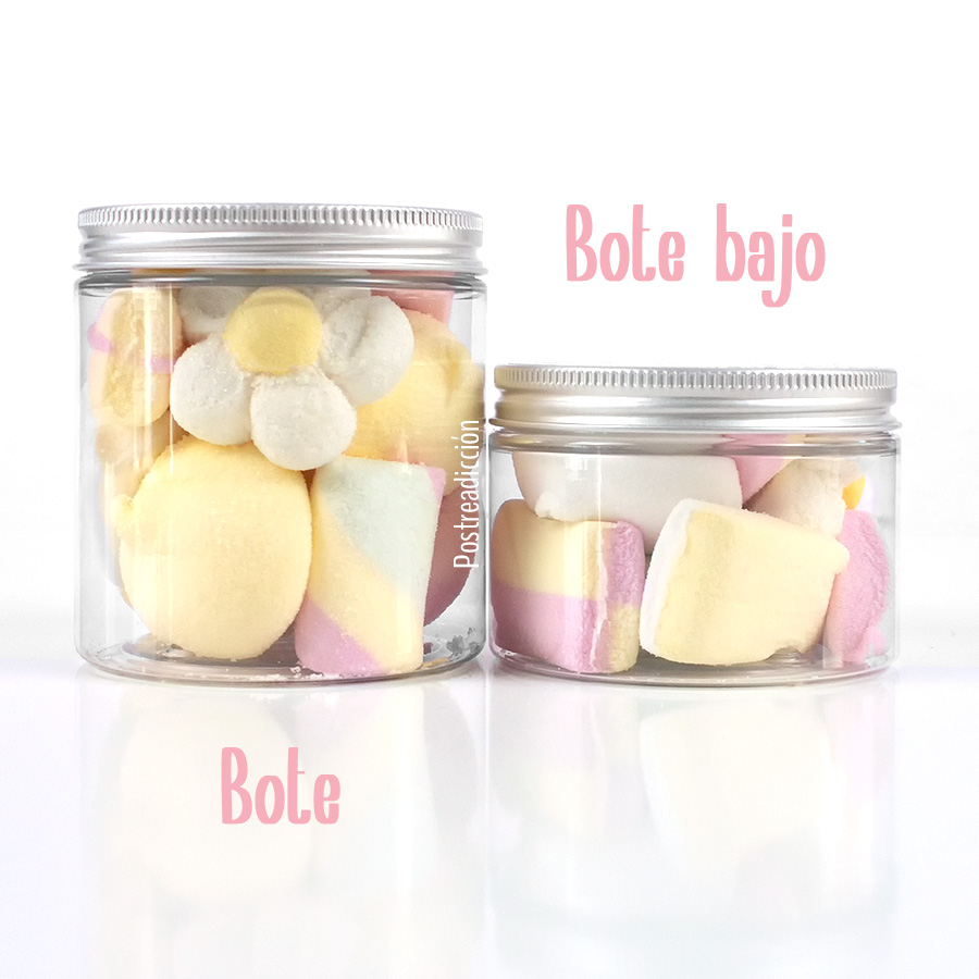 Envase de plástico PET transparente con tapa de aluminio, apto para uso alimentario.